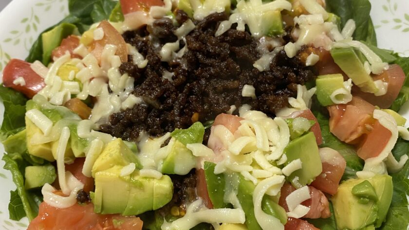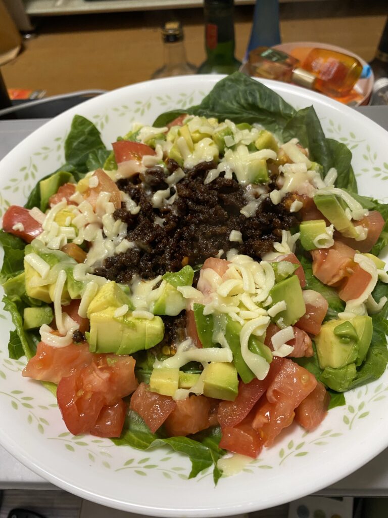 牛挽肉120 トマト1 アボカド1/2 チーズ ロメインレタス