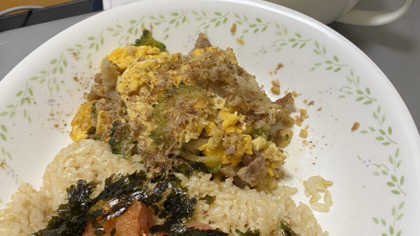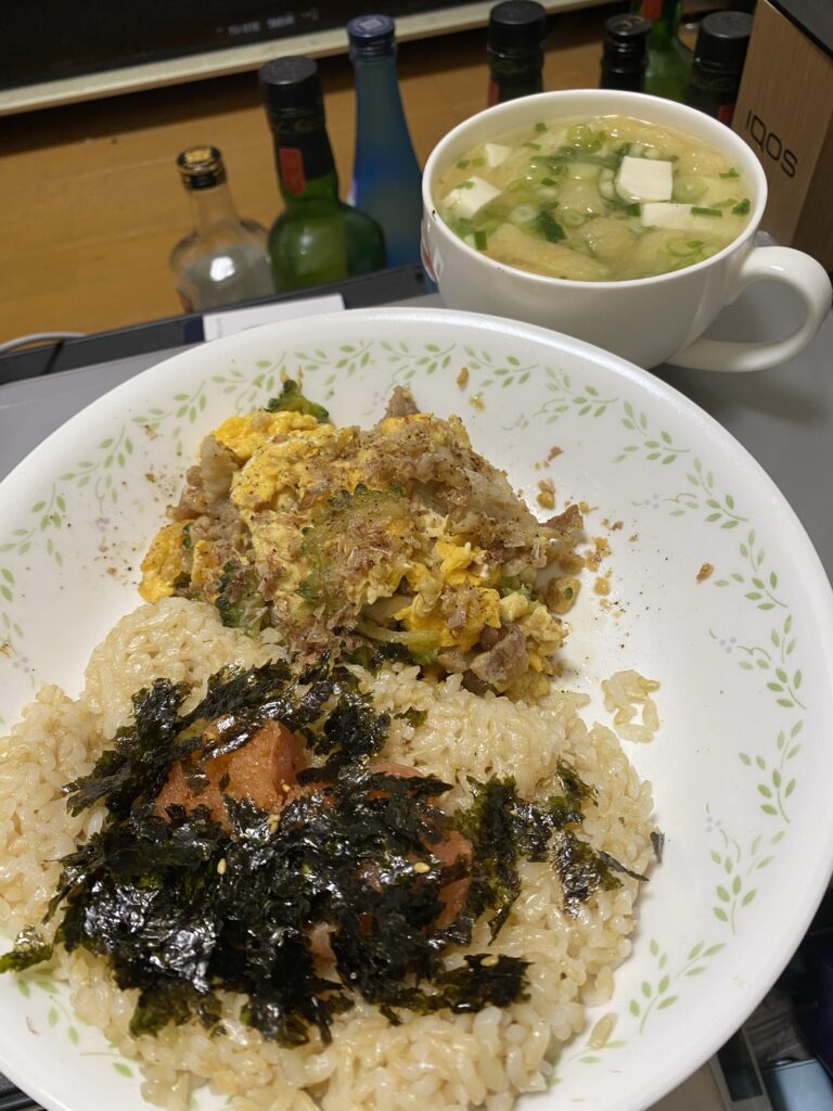 ゴーヤチャンプルー残り たらこ海苔玄米ごはん 味噌汁