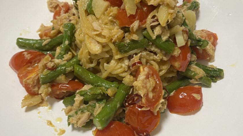 ツナ アスパラ ミニトマト ペペロンチーノ
