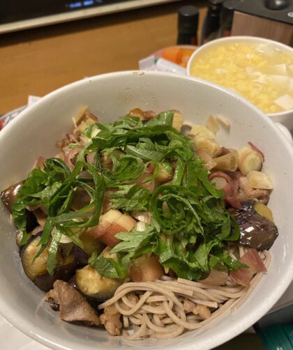 豚ナスみょうが大葉蕎麦 玉子豆腐スープ