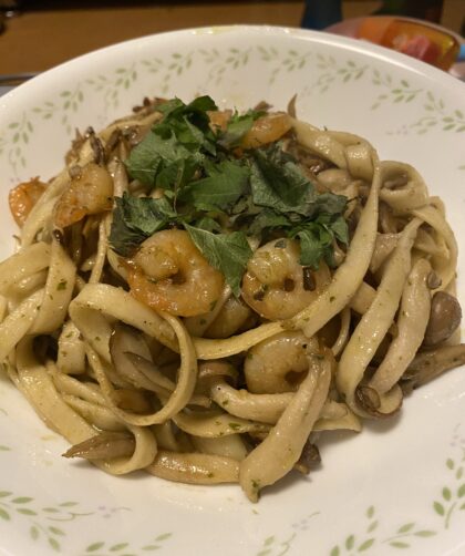 海老 しめじ 舞茸 醤油バジル 玄米パスタ