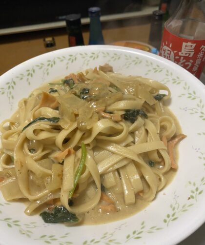 スモークサーモン 玉ねぎ ほんれん草 玄米パスタ …
